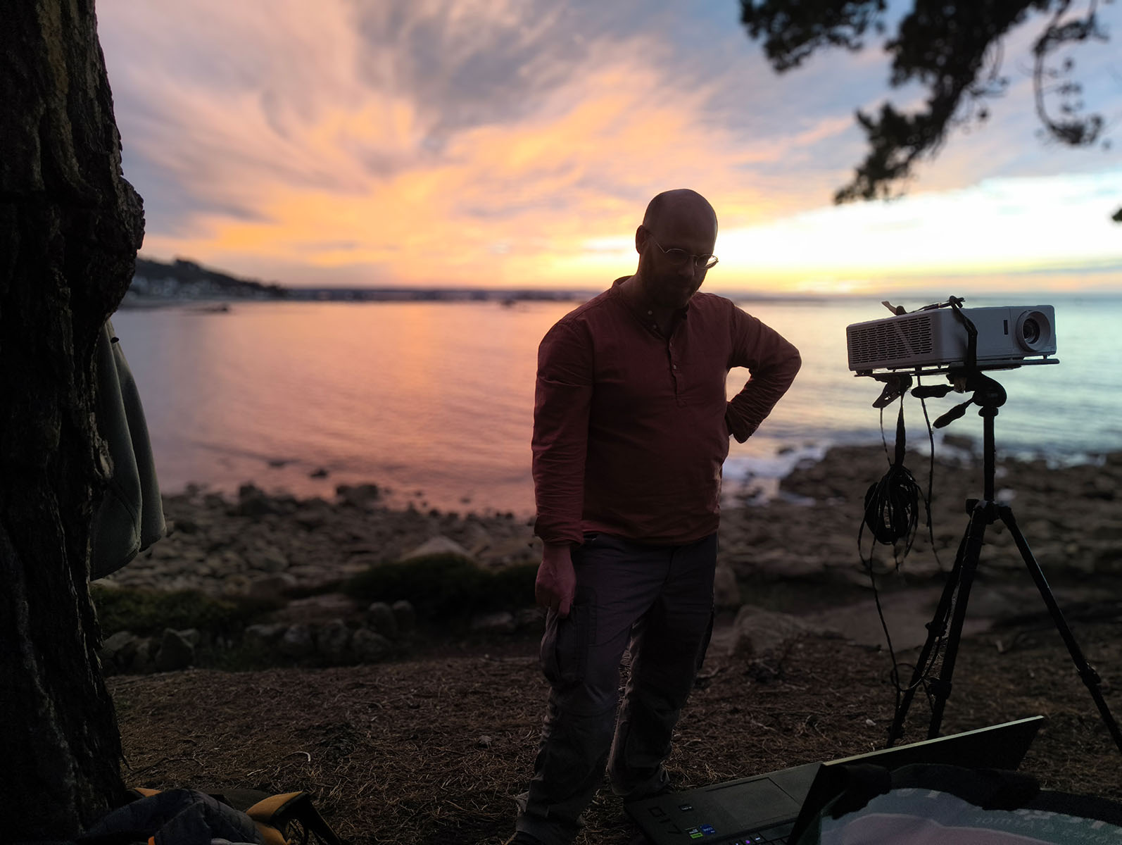 Lors de nos recherches de création dans le parc, nous avons testé la projection de photos de nuit, à même le paysage. L'anamorphose produite nous a tout de suite parlé : c'est une technique avec laquelle je travaille déjà beaucoup, mais ici la projection (et non le recouvrement de textures) se surimprime sur le paysage, elle le complète et ne la remplace pas. Habituellement les anamorphoses avec lesquelles je travaille sont essentiellement numériques (projections 3D, photogrammétrie, etc), mais ici la simplicité du dispositif et la précision absolue des détails nous emmène dans autre chose.