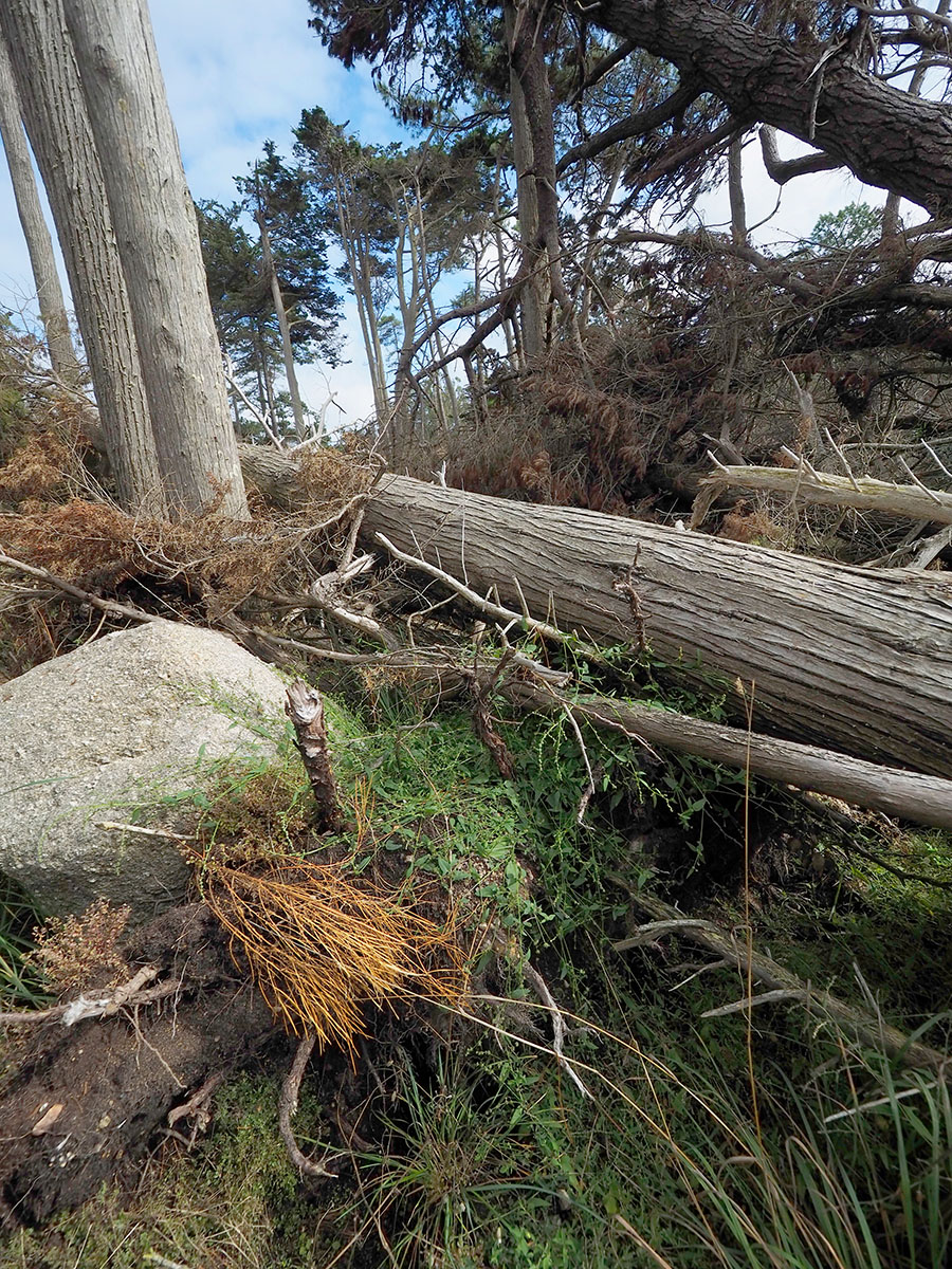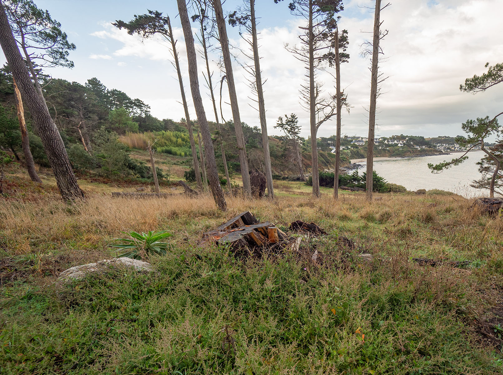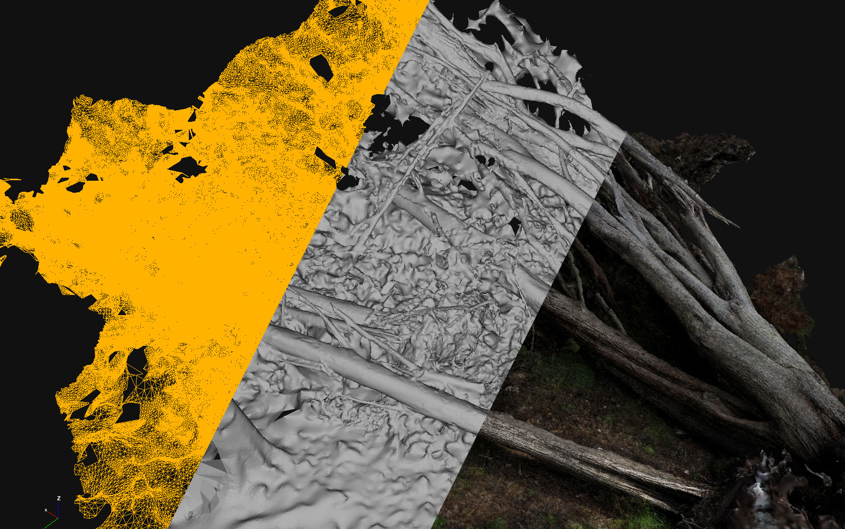 C'est la nature à la fois contrastée et marquée de ce nouveau paysage qui nous a poussé à réaliser cette vidéo : témoigner de cette cicatrice qui restera à jamais visible. L'idée est donc de superposer les images actuelles de la pointe du Dourven aux volumes que formaient les arbres tombées après la tempête. Pour ce travail, ce sont les milliers de photos qui ont été prises lors de notre premier séjour (en septembre 2024) qui ont servi à réaliser des photogrammétries (photographies 3D). Le principe est simple : en photographiant un objet sous toutes ses coutures, il est possible d'en retrouver les volumes virtuels grâce à des logiciels.