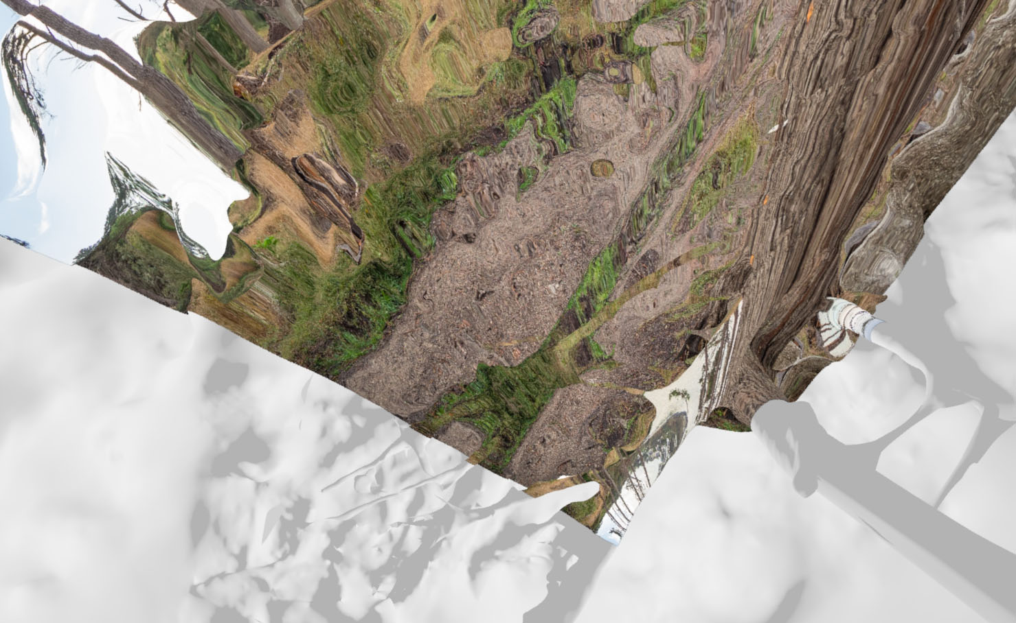 Une fois cette scène obtenue, nous sommes retournés sur place l'année suivante (à l'endroit exact du scan 3D) afin d'y réaliser de nouvelles photos, cette fois-ci avec ce paysage du parc réhabilité. En prenant des repères lors de la prise de vue, il est alors possible de les re-positionner très précisément dans la scène 3D originale. Dès lors, nous avions un environnement virtuel combinant les deux paysages : les volumes des arbres tombés en septembre 2024 et les photos de la même zone en septembre 2025.