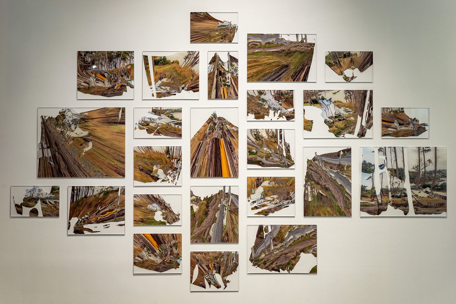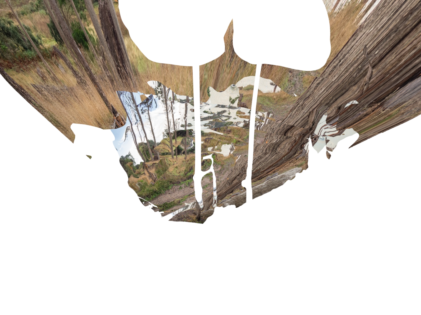 Anamorphoses des photos utilisées pour réaliser la vidéo « Le réel se souvient mal ». Chaque image, photographiée juste après la restauration du parc, se voit ainsi reprojetée dans son espace mais déformée par les volumes encore présents des arbres tombés. À l’image d’un herbier ou d’une boîte à insectes, ces échantillons se retrouvent écrasés dans leur paroi de verre, comme trace d’un prélèvement scientifique.