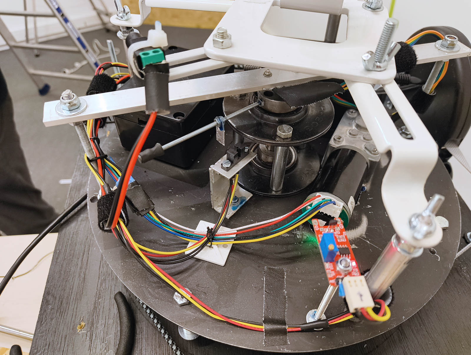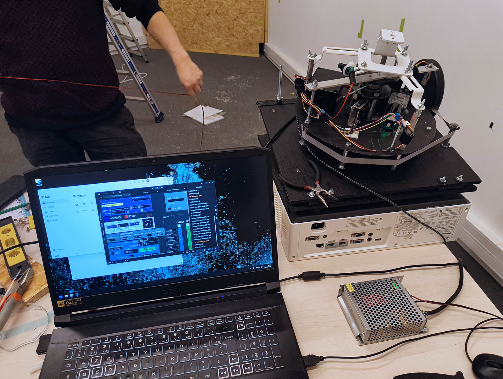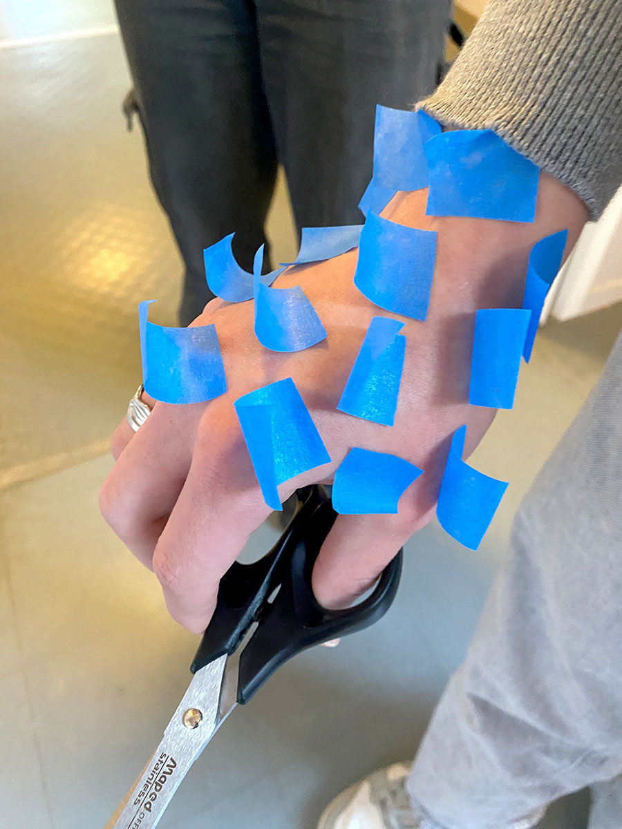 Afin de récupérer un modèle 3D fidèle et précis du hall du lycée, il a fallu réaliser une photogrammétrie des lieux. Les scotchs bleus servent de repères pour les zones unies et lisses qui sont souvent mal comprises par le logiciel.