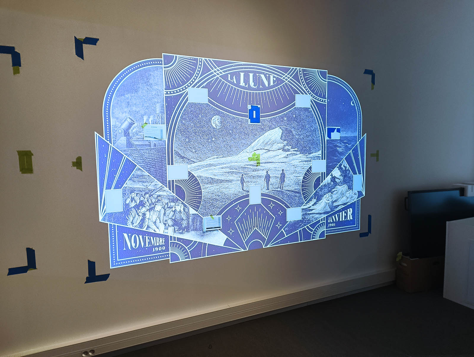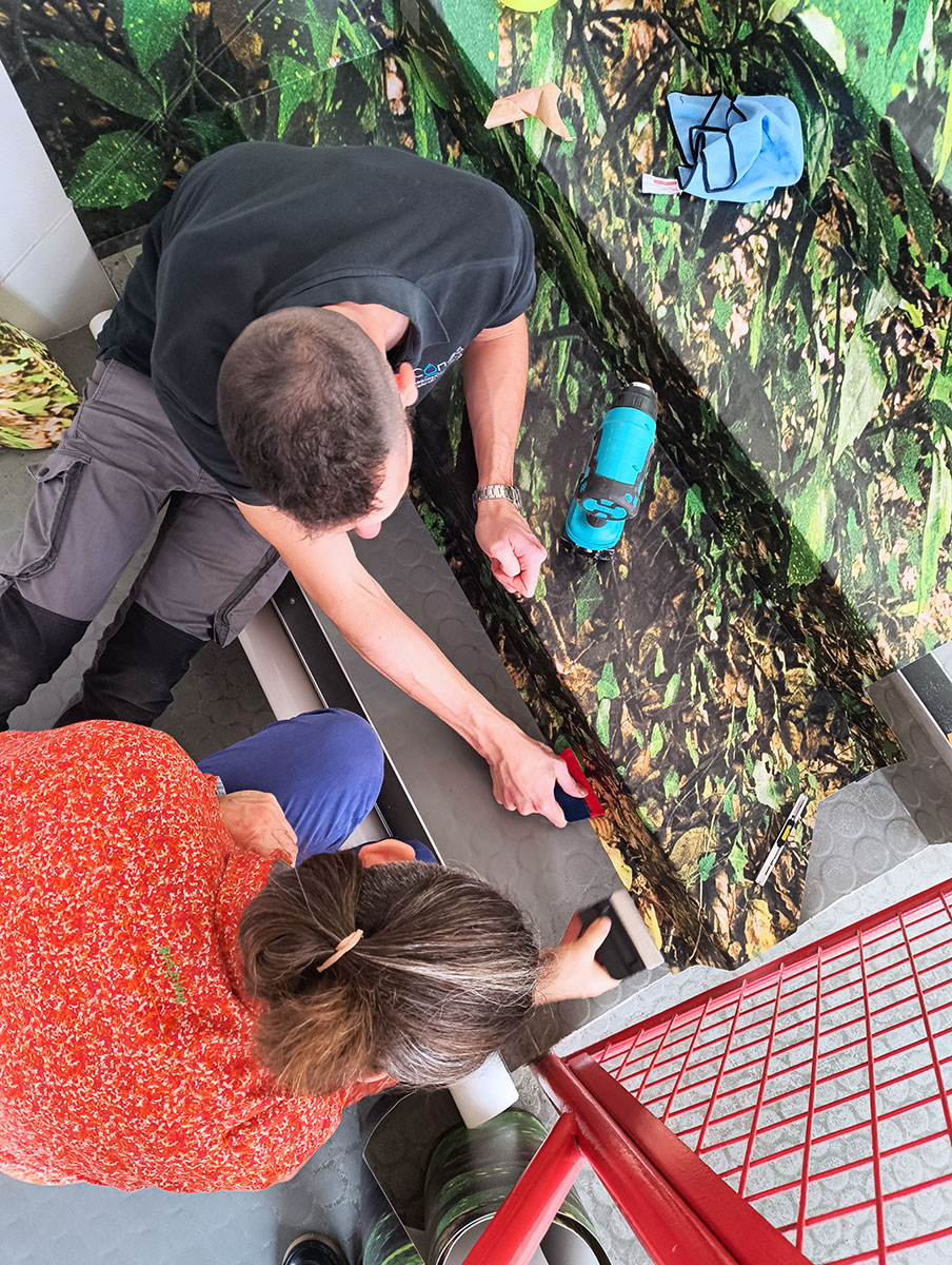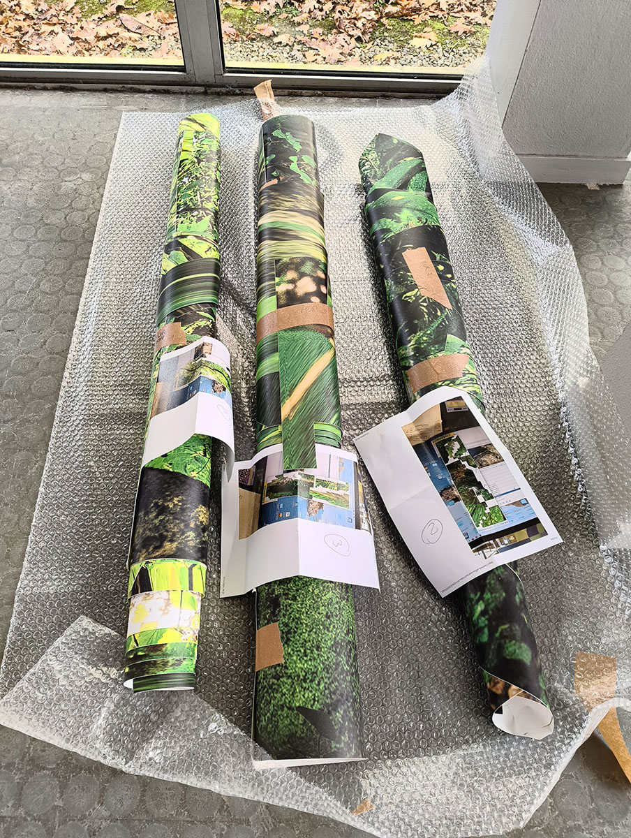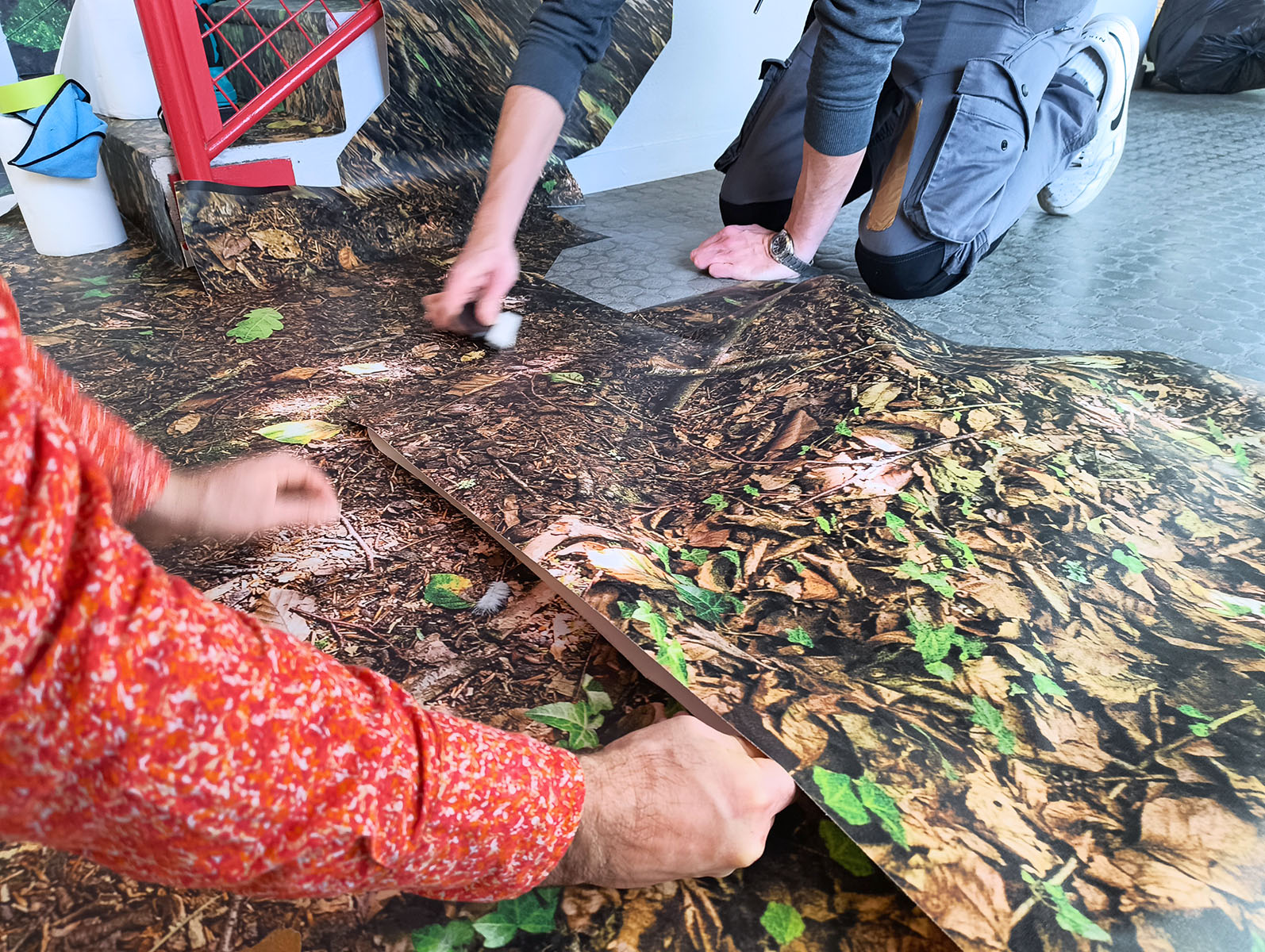 Grâce à la combinaison de plusieurs logiciels, des découpes techniques et une mise à plat des volumes a été effectuée. On obtient ainsi des pans de papier de 120 cm de large (la largeur maximale des laizes de l'imprimeur) sur plusieurs dizaines de mètres de longueur. Une fois l'impression terminée, l'imprimeur livre les adhésifs en rouleau, prêts à poser.