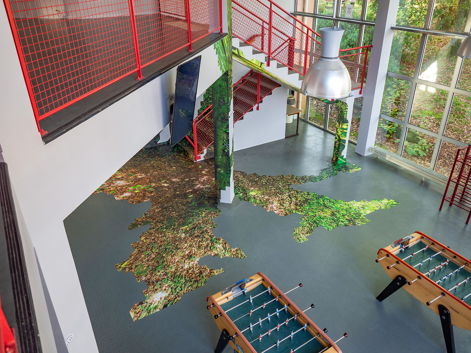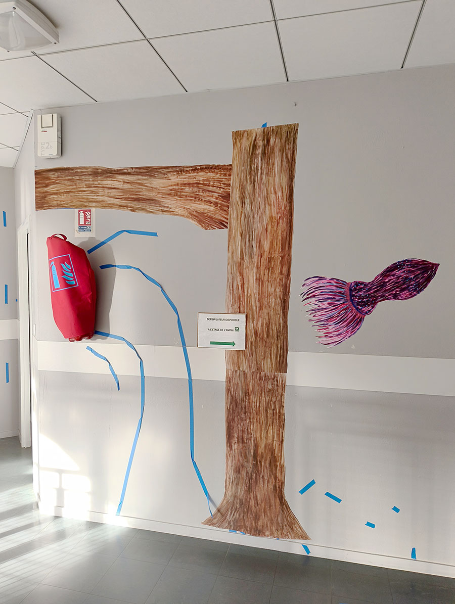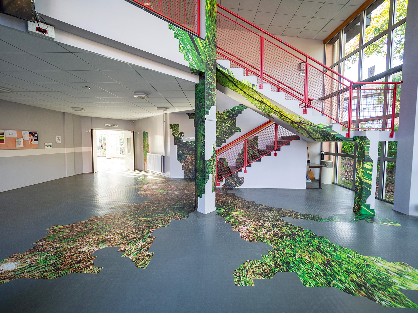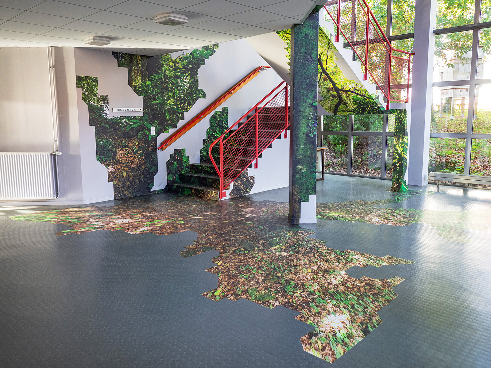 À l'instar de la pièce Pin des Landes (2024), l'espace du lycée devient le nouveau support de la projection d'un paysage de forêt.