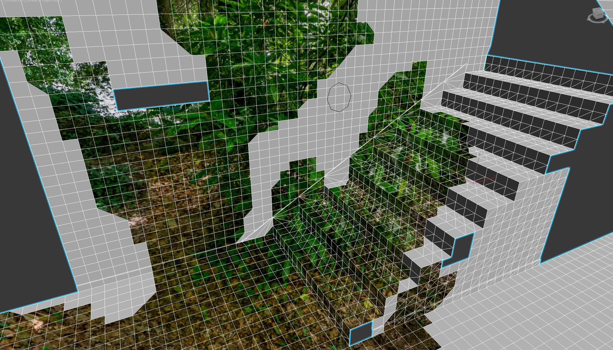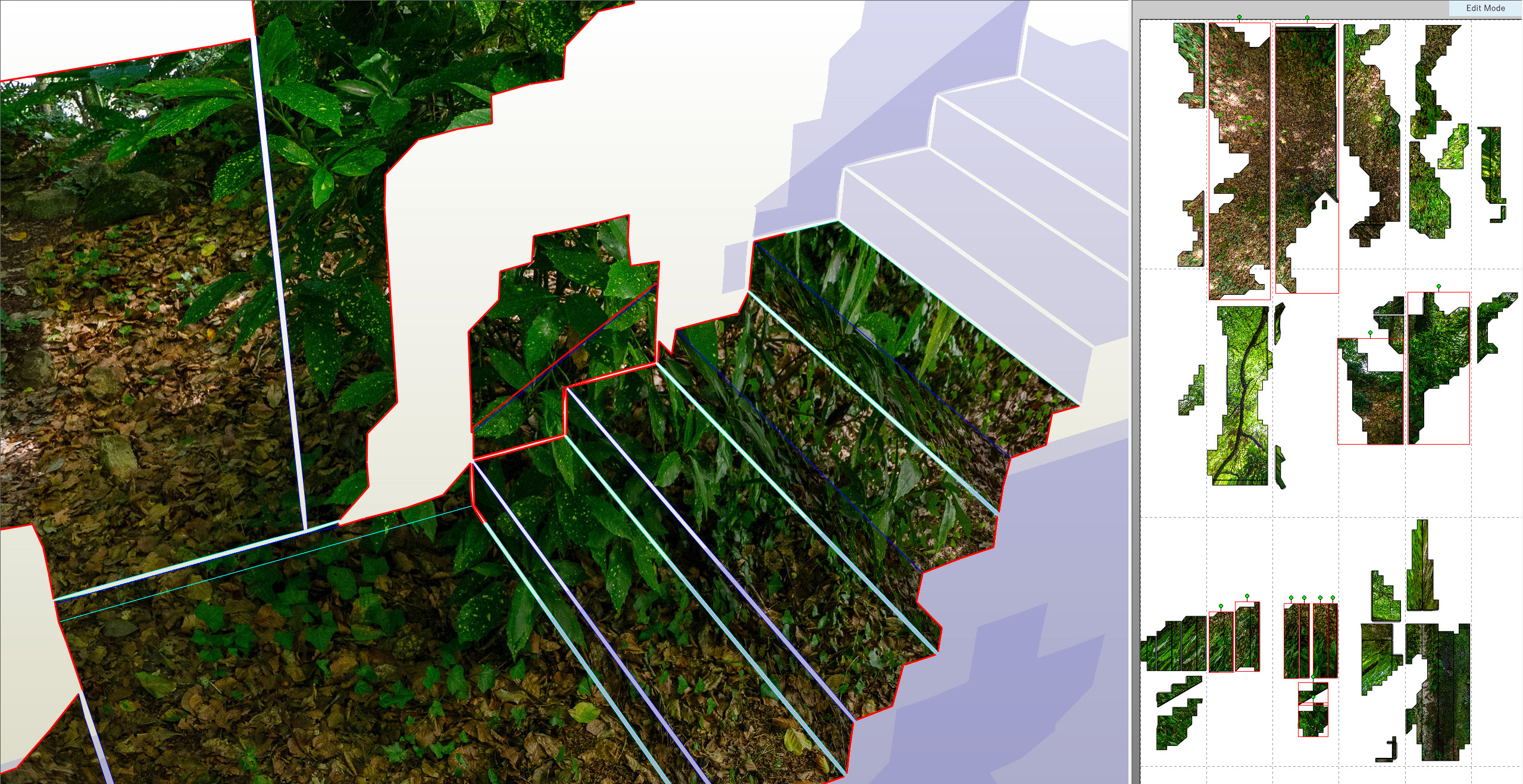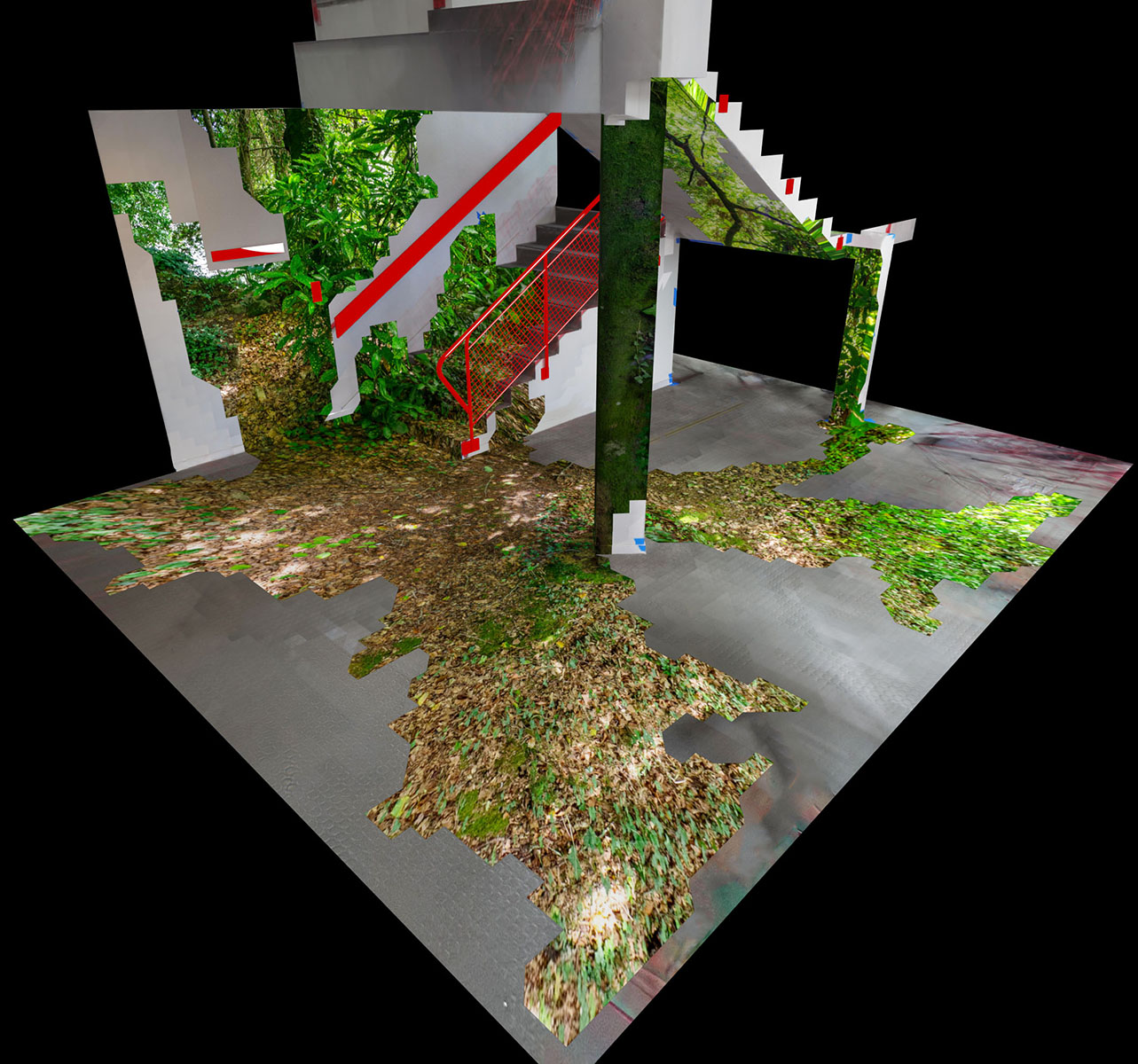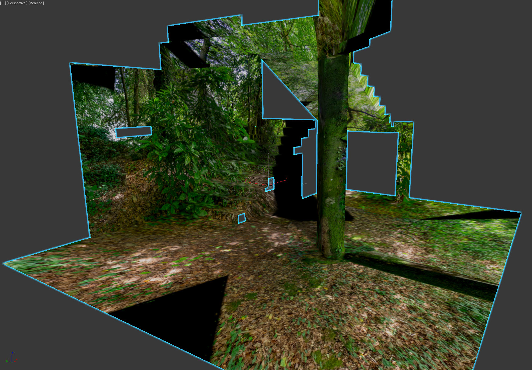 Les textures s'appliquent au mieux, subissant déformations, étirement et anamorphoses. Un des piliers du hall fait office de tronc, tandis que les escaliers découpent et morcellent les bosquets situés sur les pourtours du scan.