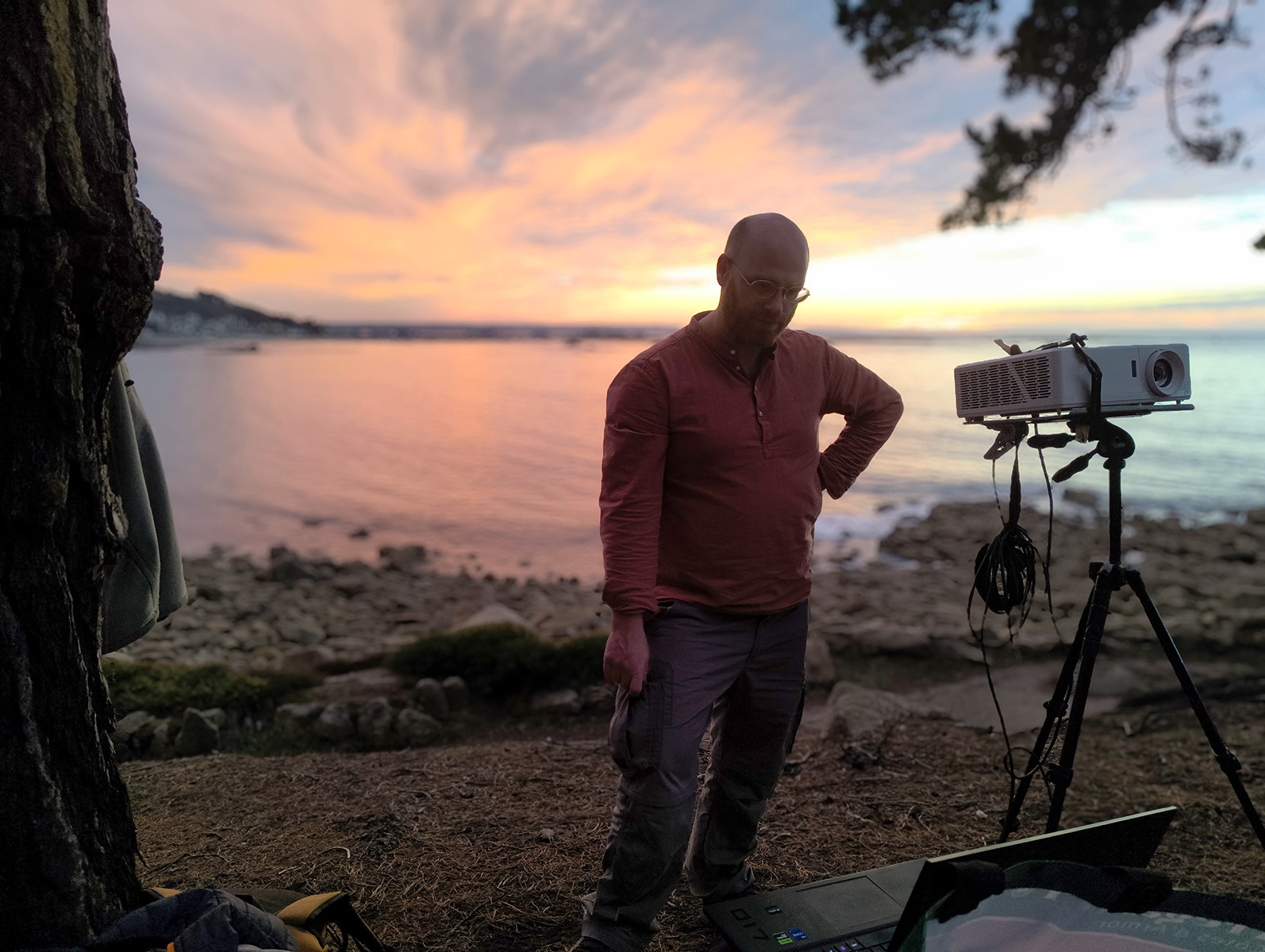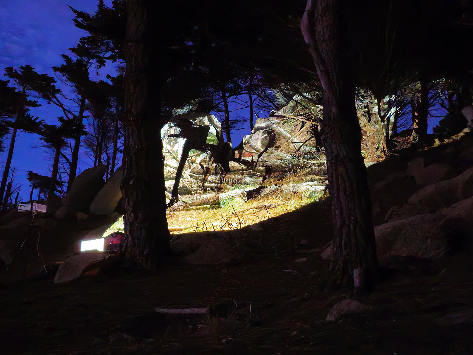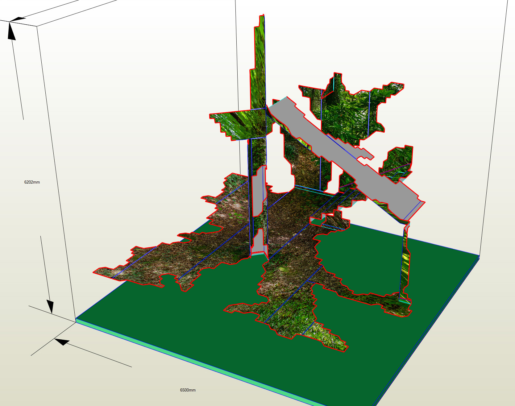 Partant des spécificités architecturales du hall du lycée, une longue étape de déambulation et d'observation en forêt a été menée afin de trouver des correspondances topographiques. Il fallait trouver un arbre et des éléments de végétation qui semblaient correspondre, peu ou prou, aux piliers, escaliers et murs du lycée. Une dizaine de scans ont été effectués, essayés afin de sélectionner celui qui donnait le rendu graphique le plus abouti.