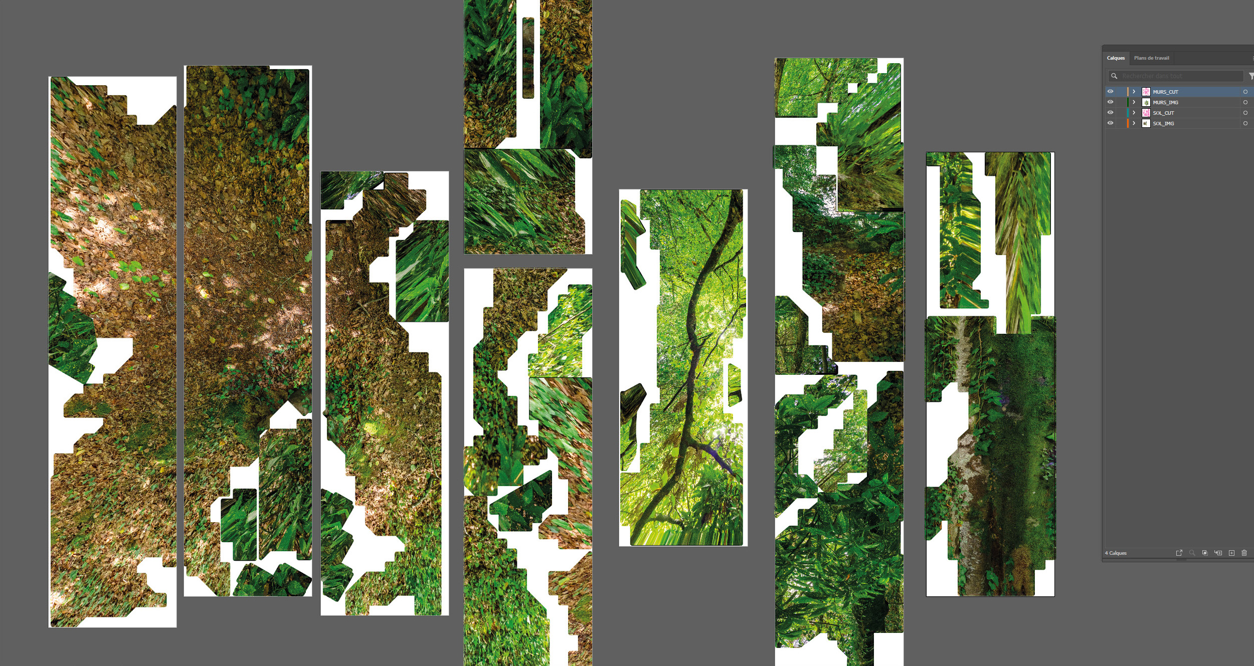 Une fois les correspondances trouvées, le volume 3D de l'arbre a été remplacé par celui du lycée, donnant une vision globale de l'ensemble des murs texturés par la végétation. Par la suite, une étape de découpe a été réalisée afin de donner à la fois un aspect plus graphique (effet de"colonisation" ou "d'explosion") et de permettre de pouvoir réaliser les collages sans contraintes techniques pour les étapes suivantes.